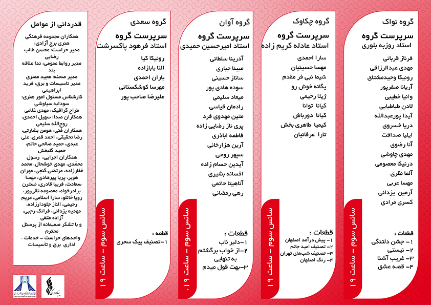- اطلاعات تماس: برای اطلاعات بیشتر و شرکت در این کنسرت بزرگ با شمارههای ۴۴۶۰۴۳۹۸ یا ۴۴۴۴۷۹۸۹ تماس بگیرید یا به آموزشگاه مراجعه نمایید.